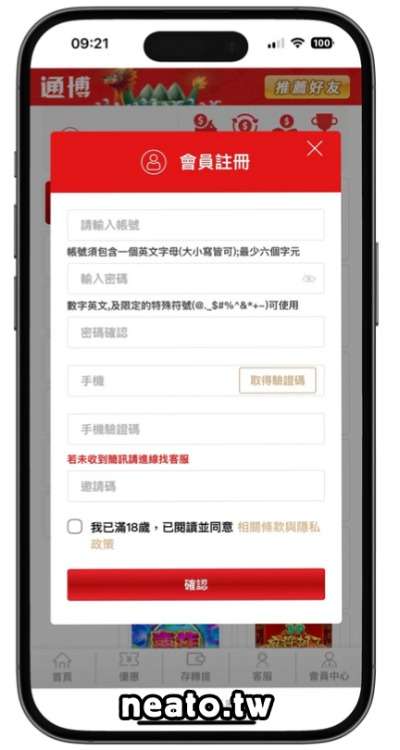 Step 1:前往通博娛樂城官網或是通博手機版,找到並點擊「註冊」按鈕。