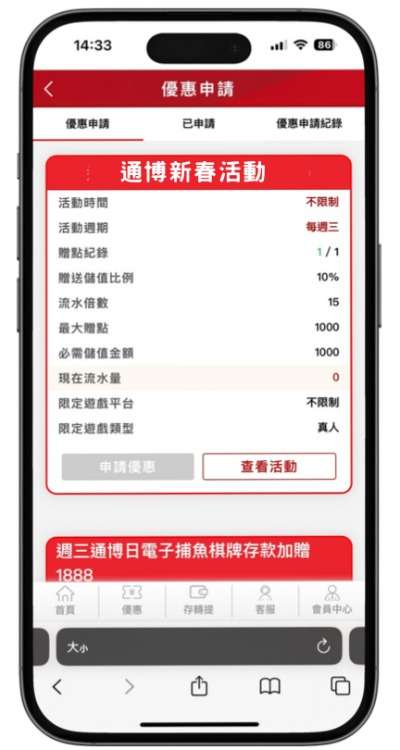 Step 3:會員登入後,前往「優惠中心」,即可參與通博娛樂城的新春活動!