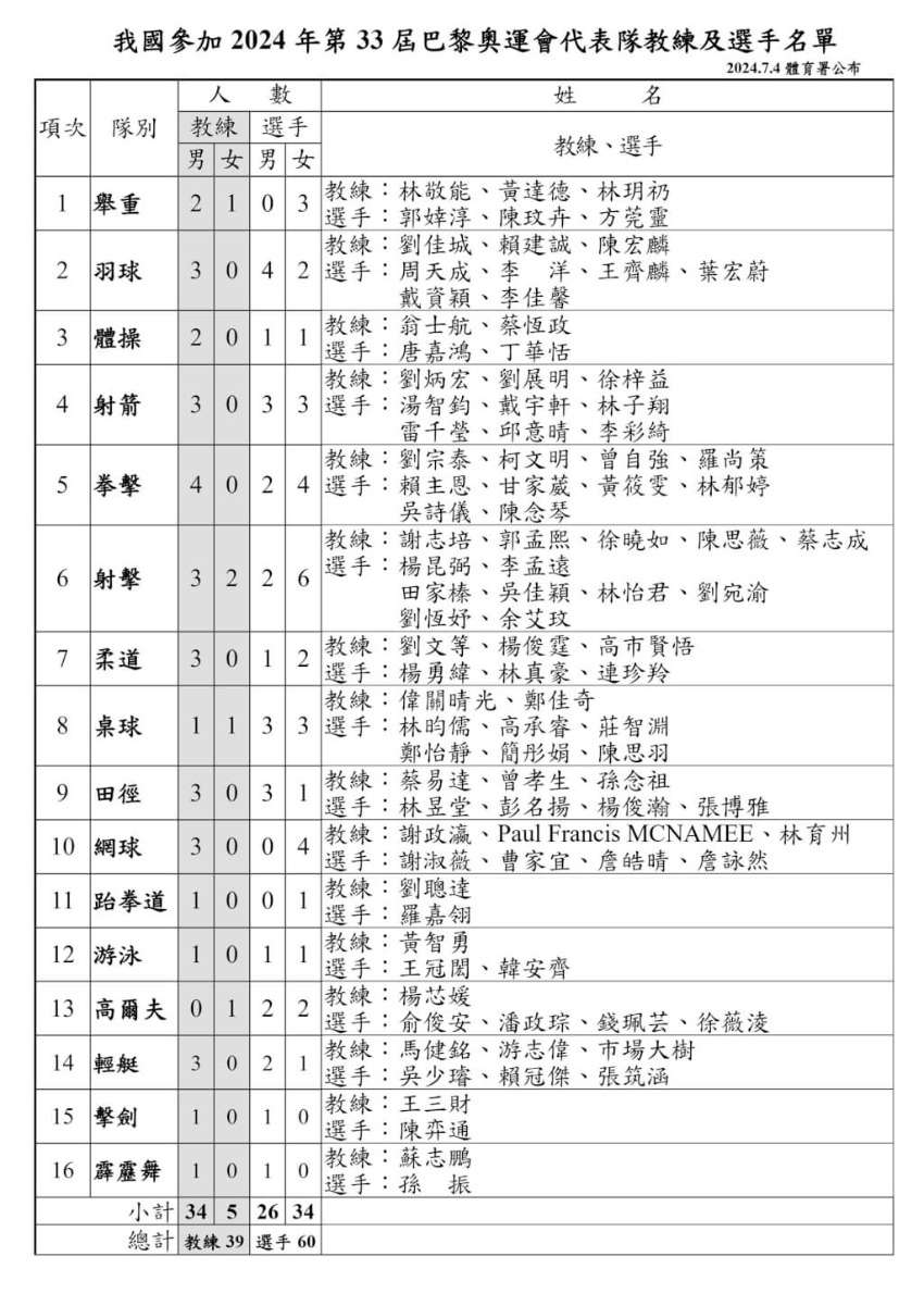 2024年巴黎奧運將於7月26日至8月11日在法國巴黎舉行。中華隊代表團將派出精英選手參賽,涵蓋射箭、田徑、拳擊、輕艇激流、競技體操、射擊、游泳、桌球、跆拳道等多個項目。